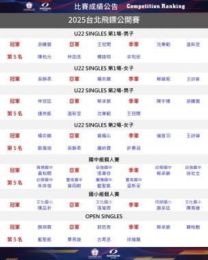 | [青少年賽事] 2025TW U22 TOUR 年度總排名/年度總決賽名單/賽程公告 | 2025-10-29 |