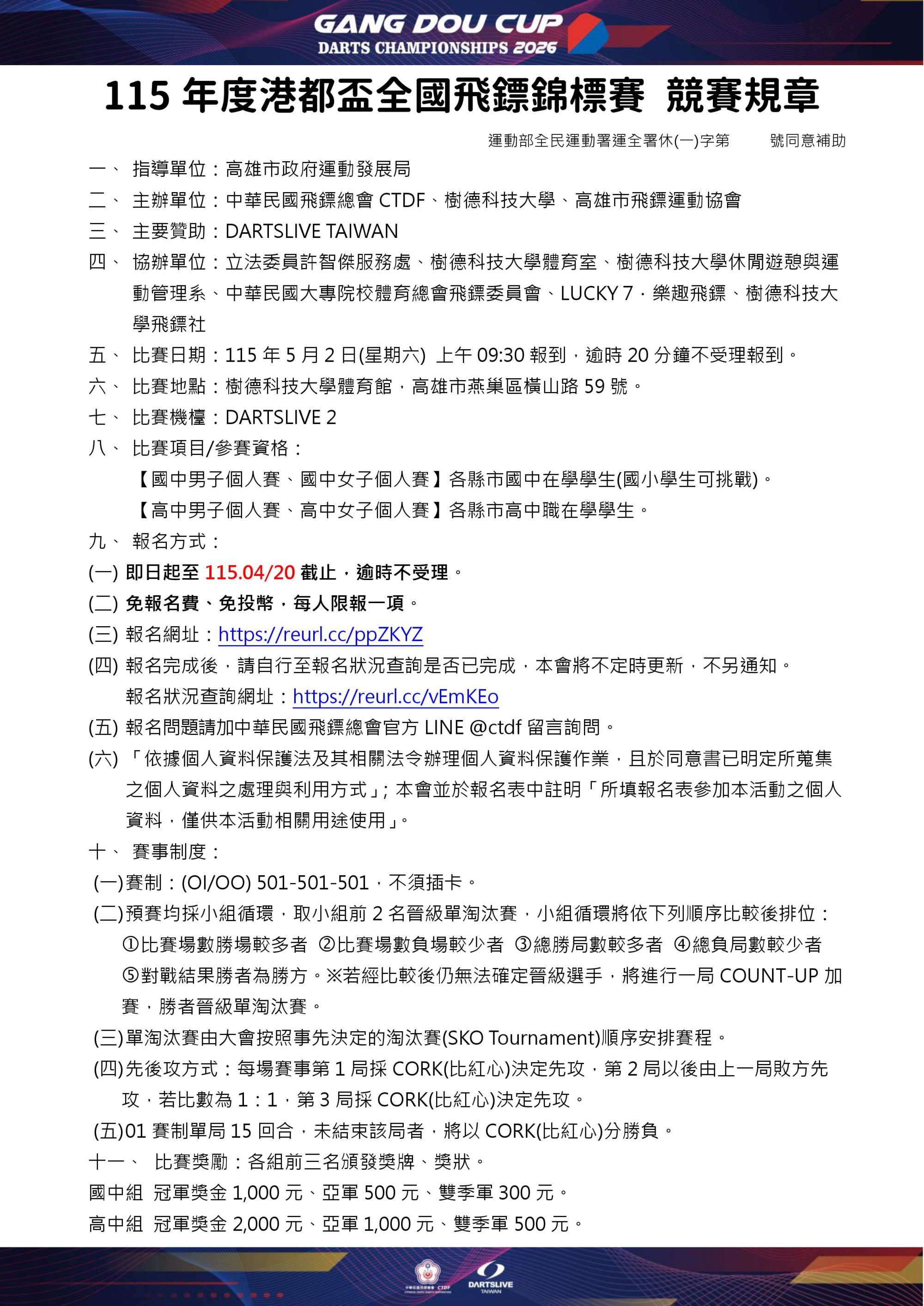 報名問題請加中華民國飛鏢總會官方LINE ID @ctdf留言詢問